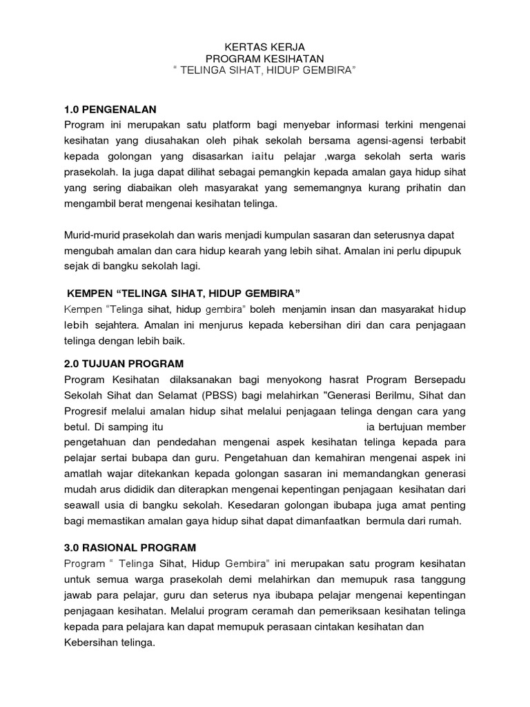 Perkhidmatan kesihatan sekolah 24 Di sampingenam Teras Utama diatas pihak kementerian menerusi program ini turutmengambilkira beberapa kriteria berikutbagi menjayakan program ini dan agar program ini sesuai dengan persekitaran dan iklim prasekolah tersebut. Kertas kerja jom hidup sihat. Sekolah kebangsaan penghulu ahmad kedah darul aman kertas kerja program alam sekitar udara bersih hidup sihat tarikh 11 13 mac 2017 tempat sk penghulu ahmad disediakan oleh fatin syazwani binti shani anjuran persatuan alam sekitar sk penghulu ahmad program alam sekitar page 1 isi kandungan 10 kertas kerja program pendidikan kesihatan 3 udara bersih hidup sihat 3 20 tujuan 3 30.